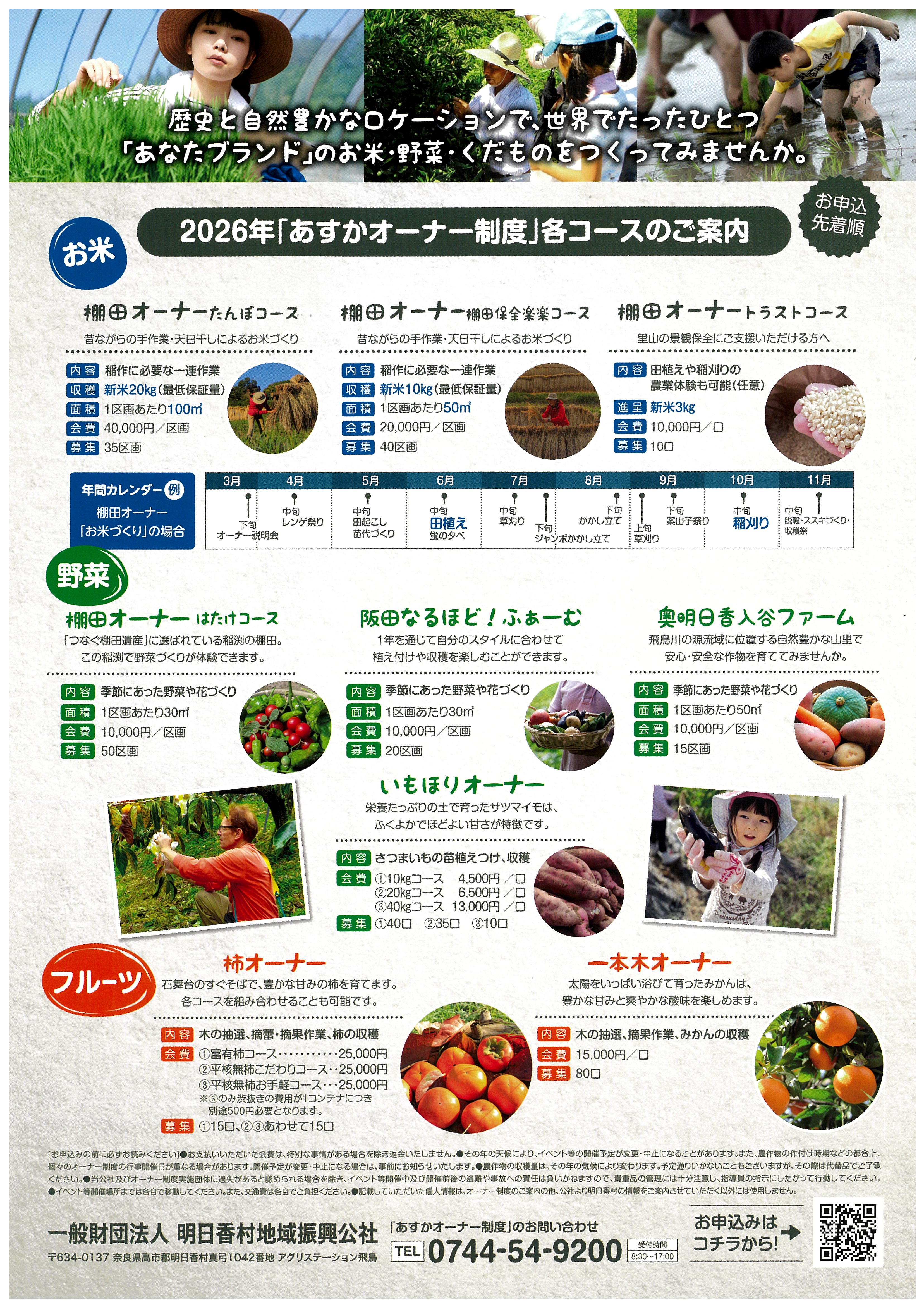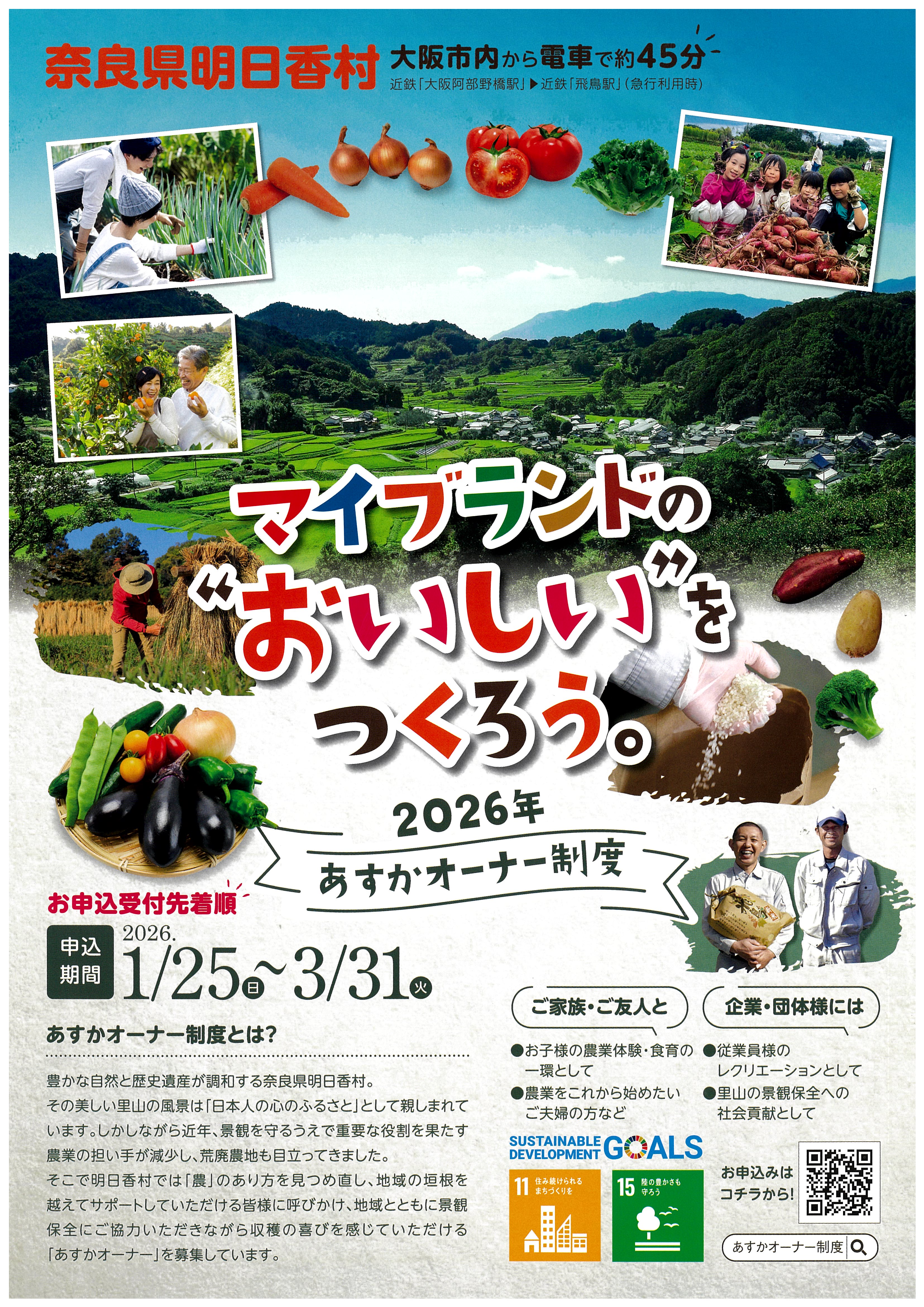 「日本人の心のふるさと」といわれる明日香の里山の風景。その美しい景観は、農業の担い手減少により、近年、荒廃も目立ってきています。そこで、明日香村では地域の垣根を越えて、ともに景観保全にご協力いただける「あすかオーナー」を募集しています。豊かな自然の中で農作物を育て、収穫の喜びを一緒に感じてみませんか?
