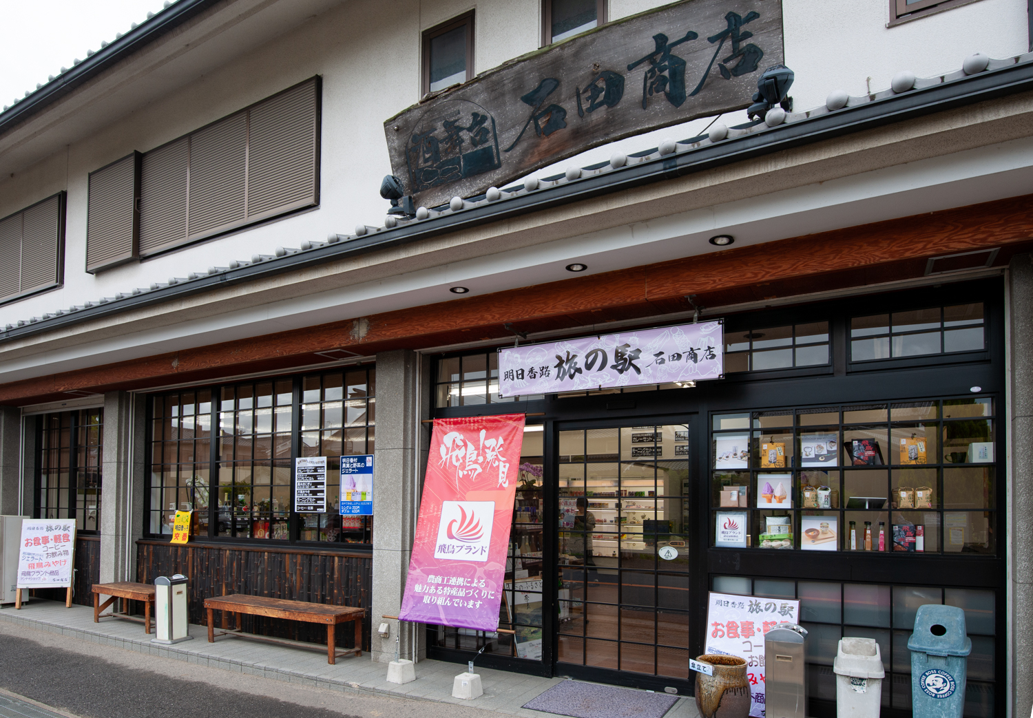 古代米やあすかルビー、紫いもなど、季節ごとに旬の味を楽しめます。飲み物やお土産の販売も。