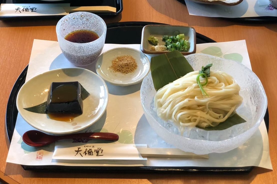 1870年創業の老舗「天極堂」の飛鳥店。葛を練り込んだ「葛うどん」をはじめとするランチメニューから、葛を使ったスイーツまで、奈良特産の葛をふんだんに使用したメニューが揃います。 特に、店内でつくりたての「葛もち」は、ぷるぷる・とろとろ食感がやみつきになる味わいです。